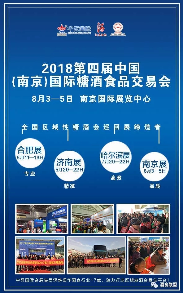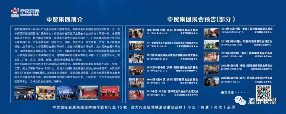 中貿集團2018年計劃將在山東濟南、安徽合肥、江蘇南京、黑龍江哈爾濱、浙江杭州等省市舉辦十余場次酒博會、食品展、餐飲展,形成聯動招商、資源互動和共享。